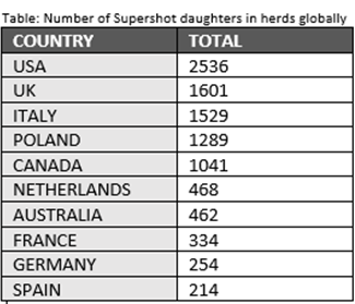 Supershot leaves a genetic legacy of 10,000 daughters in over 2,500 herds and has produced over 350,000 units of semen during his lifetime, of which a large proportion of this was sexed semen.