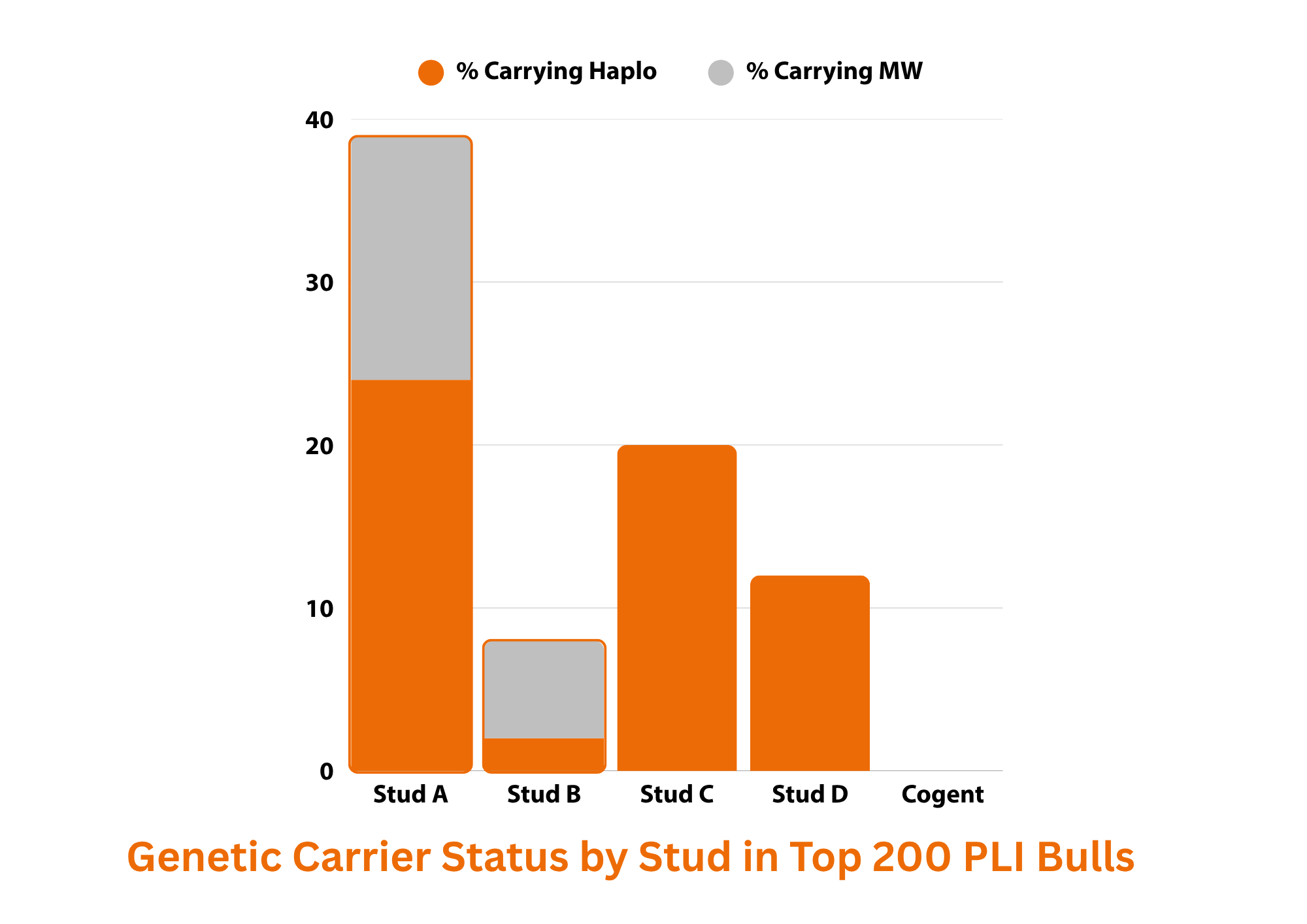 These figures show that Cogent is the only stud with zero carriers of either the CACNA1S mutation or a known negative haplotype among bulls in the top 200 for PLI. This outcome is not coincidental. It reflects our deliberate policy of testing all sires before releasing and maintaining a 0% tolerance for MW carriers in our Holstein line-up.