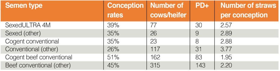 With average conception rates across cows and heifers comparable to conventional (see table, above), Mr Williams has the confidence to target sexed semen on his best females to produce his required 50-60 replacements a year.