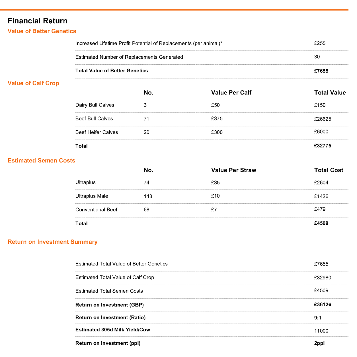 With additional semen costs of £4509, the value of better genetics entering the herd due to more targeted breeding is £7,655, and the value of his calf crop increases by £32,980, based on a £375 beef bull, £300 beef heifer, and a £50 beef calf. That’s a total ROI of £36,126.