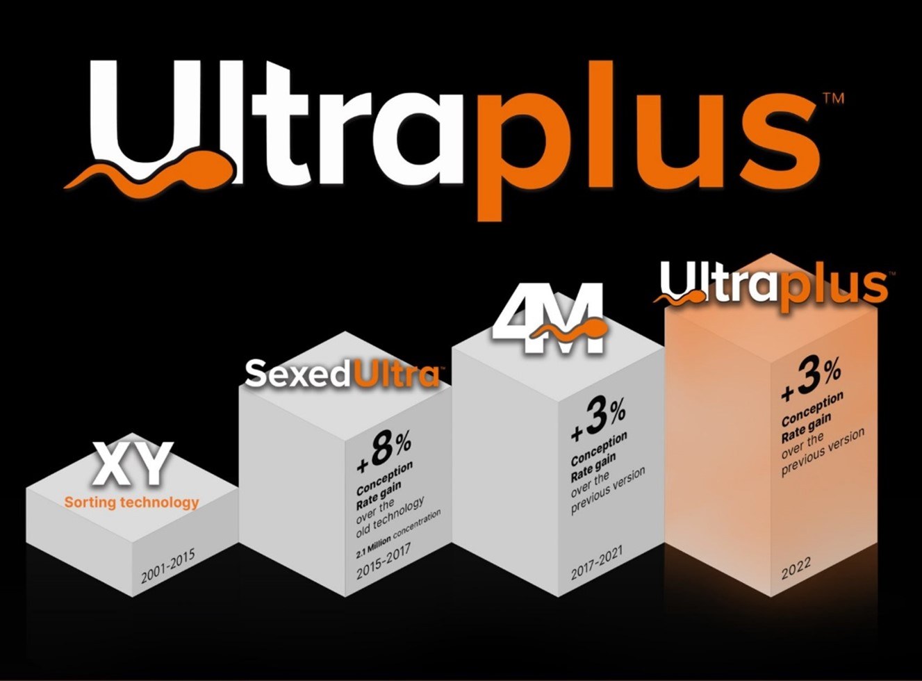 Fast forward another few years, and in September 2022, Cogent launched its next generation of gender-sorted semen – Ultraplus. This delivered a further improvement in conception rates of 3%, comparable with the previous SexedULTRA4M, making it the highest fertility gender-sorted semen ever available.