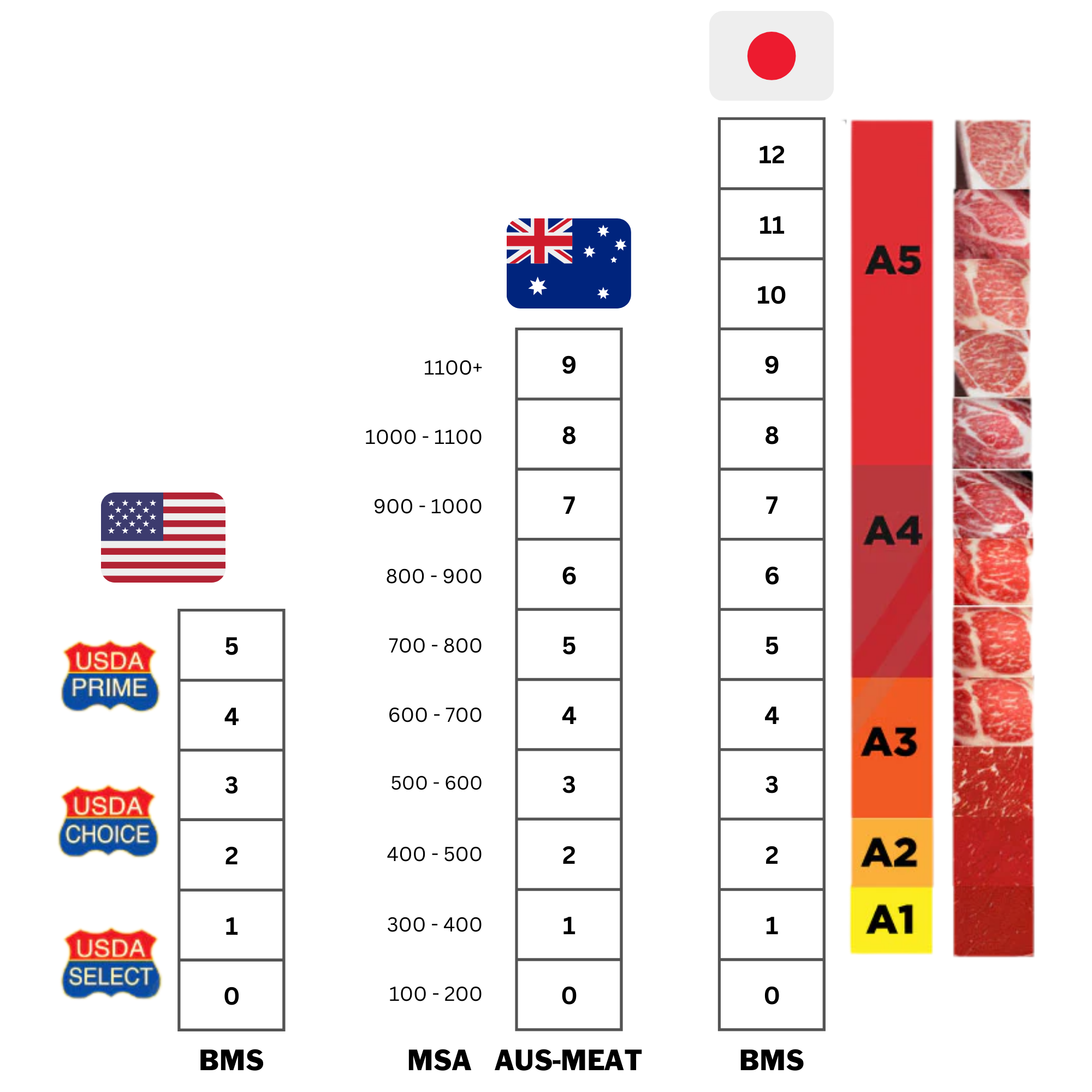 What's particularly relevant for UK producers is how these standards compare internationally. While the Japanese system reserves its top A5 grade for truly exceptional beef, other major Wagyu-producing countries have adapted their approaches. Australia, for instance, uses a system that aligns with the Japanese scale but ranges from 0 to 9+. For context, even USDA Prime beef – considered top-tier in conventional markets – typically equates to only a BMS of 5 on the Japanese scale, highlighting the exceptional potential of Wagyu genetics.